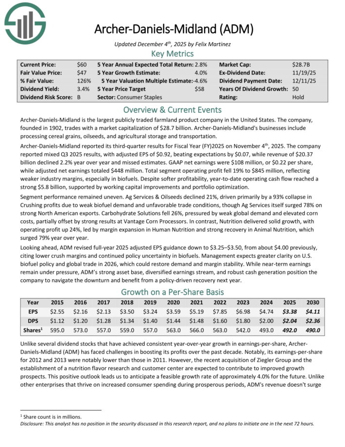 Archer-Daniels-Midland reported its third-quarter outcomes for Fiscal 12 months (FY)2025 on November 4th, 2025. The corporate reported combined Q3 2025 outcomes, with adjusted EPS of $0.92, beating expectations by $0.07, whereas income of $20.37 billion declined 2.2% yr over yr and missed estimates.