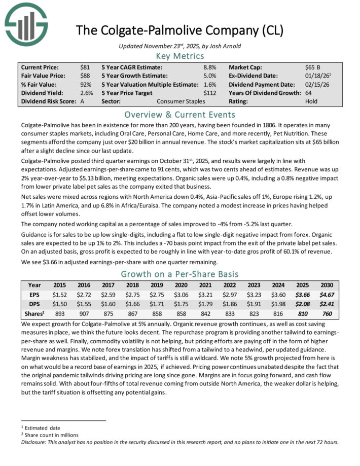 Colgate-Palmolive posted third quarter earnings on October thirty first, 2025, and outcomes have been largely in keeping with expectations. Adjusted earnings-per-share got here to 91 cents, which was two cents forward of estimates.