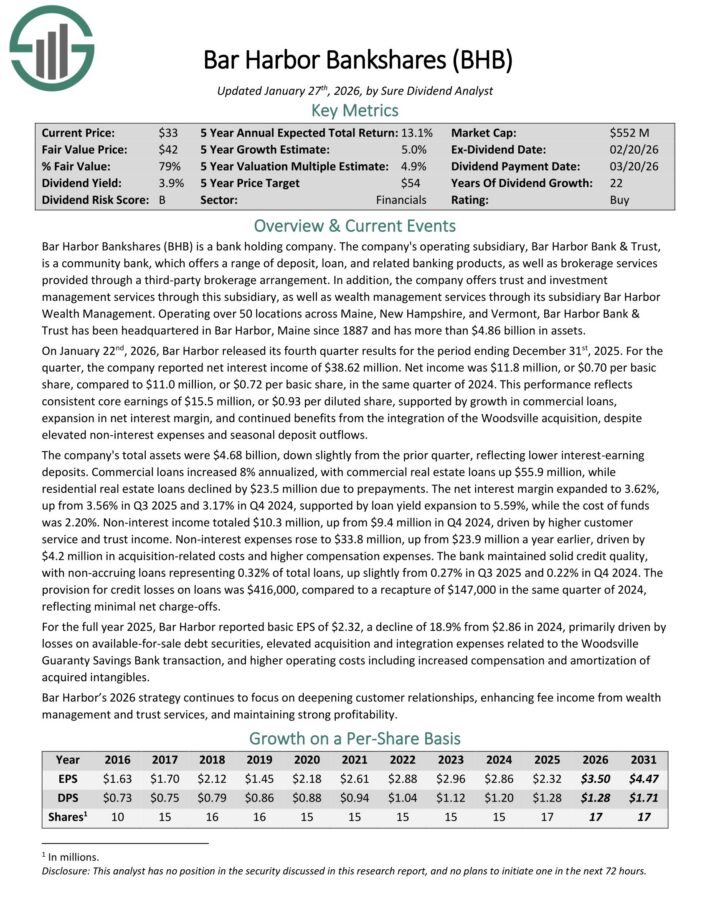 Bar Harbor Bankshares (BHB) is a financial institution holding firm. The corporate’s working subsidiary, Bar Harbor Financial institution & Belief, is a neighborhood financial institution, which provides a spread of deposit, mortgage, and associated banking merchandise, in addition to brokerage providers supplied by a third-party brokerage association.