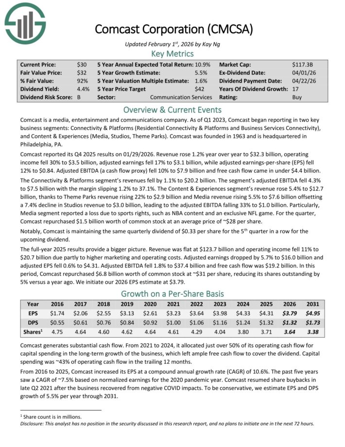 Comcast reported its This autumn 2025 outcomes on 01/29/2026. Income rose 1.2% yr over yr to $32.3 billion, whereas working earnings fell 30% to $3.5 billion.