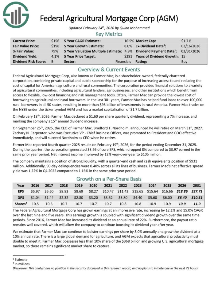 On February 18th, 2026, Farmer Mac declared a $1.60 per share quarterly dividend, representing a 7% enhance, and marking the corporate’s fifteenth annual dividend enhance.