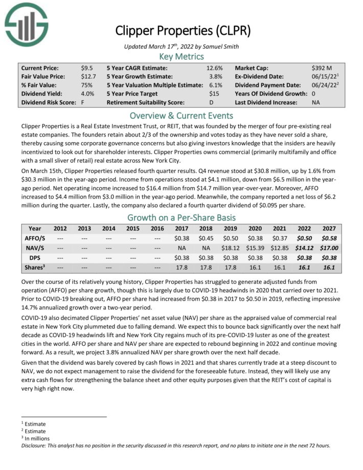 Click here to download our most recent Sure Analysis report on Clipper Realty (preview of page 1 of 3 shown below).