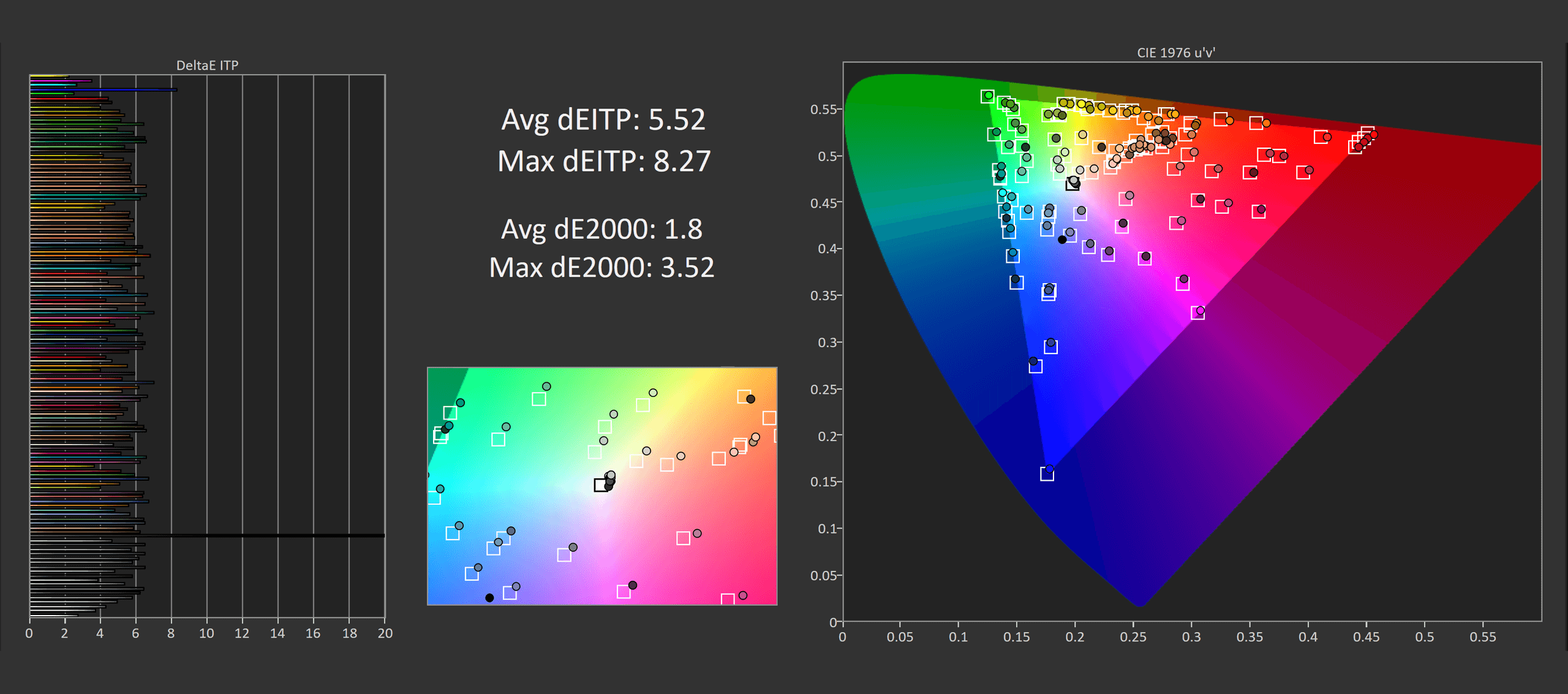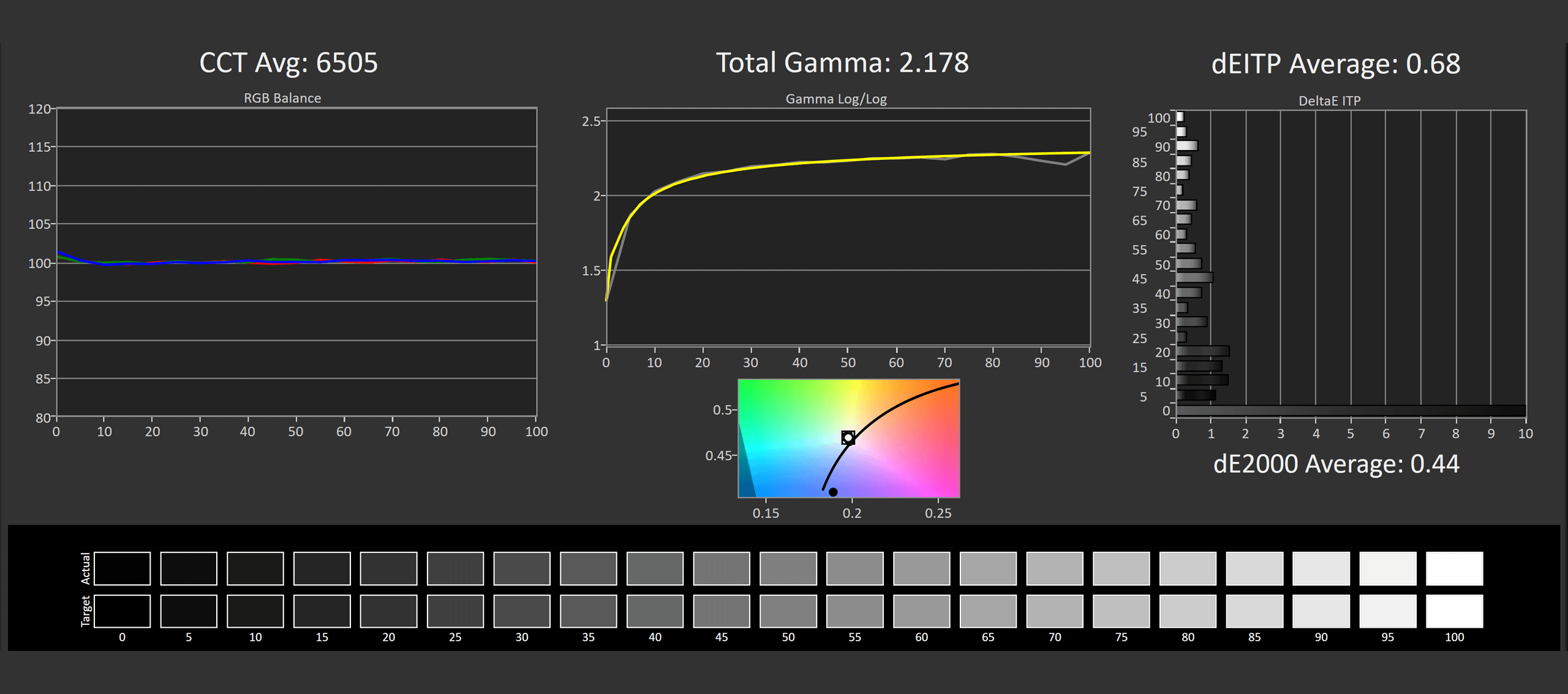 Manufacturing unit colour efficiency is first rate, greyscale deltaEs might be just a little tighter however total fairly cheap, whereas saturation and ColorChecker outcomes are wonderful because the monitor makes use of sRGB gamut emulation for SDR content material by default. This prevents oversaturation from the manufacturing unit, so usually the picture high quality is fairly correct in comparison with most different gaming displays.